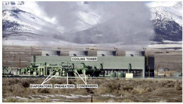 最新的USGeo拉夫特河發(fā)電站坐落在起初的電站南南東方向約600m的地方。這個最新的發(fā)電機(jī)組的能量對流系統(tǒng)是一個部分回?zé)?,二級,雙壓力雙循環(huán)發(fā)電機(jī)組。有兩個單獨的單元,每一個單元都有兩個軸向流動的渦輪來驅(qū)動同一個中心發(fā)電機(jī)。一個四室的水冷卻塔為殼管冷凝器(shell-and-tube condensers)提供冷卻提供冷卻水。補(bǔ)充水是從水井中獲取的,而且需要及時處理來維持冷卻塔中的水的質(zhì)量。138℃的鹵水以大約3.15×106kg/s的速度泵向蒸發(fā)器和預(yù)熱器,循環(huán)工質(zhì)異戊烷(i-C5H12)就是在蒸發(fā)器和預(yù)熱器中吸收溫度的。換熱器只在高壓循環(huán)中才使用。